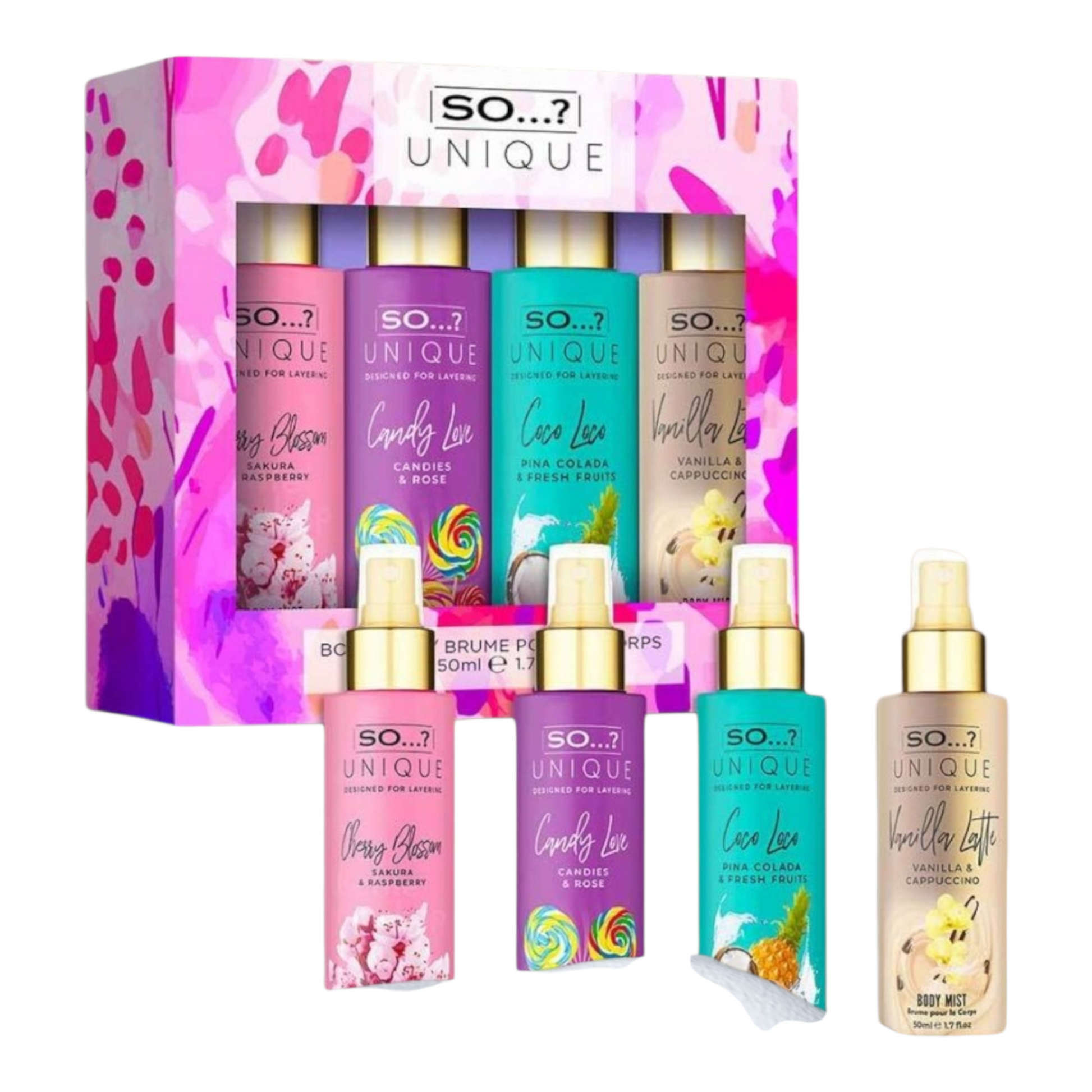 Le Coffret 4 Mini Brumes So Unique vous offre quatre fragrances enivrantes : Vanilla Candy, Sweet Pea, Truffle Cream, et White Blossom.